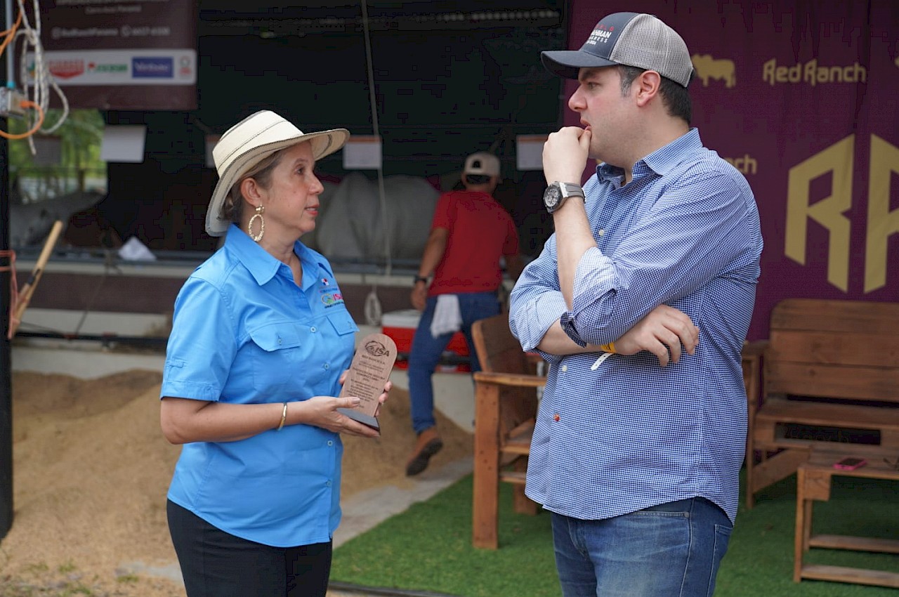 Previo al Juzgamiento de Brahman hembras, la Finca Red Ranch entregó al ISA una estatuilla en reconocimiento por apoyar a la producción agropecuaria en el país.